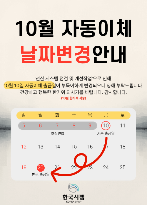 2025년 10월 '전산 시스템 점검 및 개선작업'으로 인해 10월 10일 자동이체 출금일이 부득이하게 변경되오니 양해 부탁드립니다.